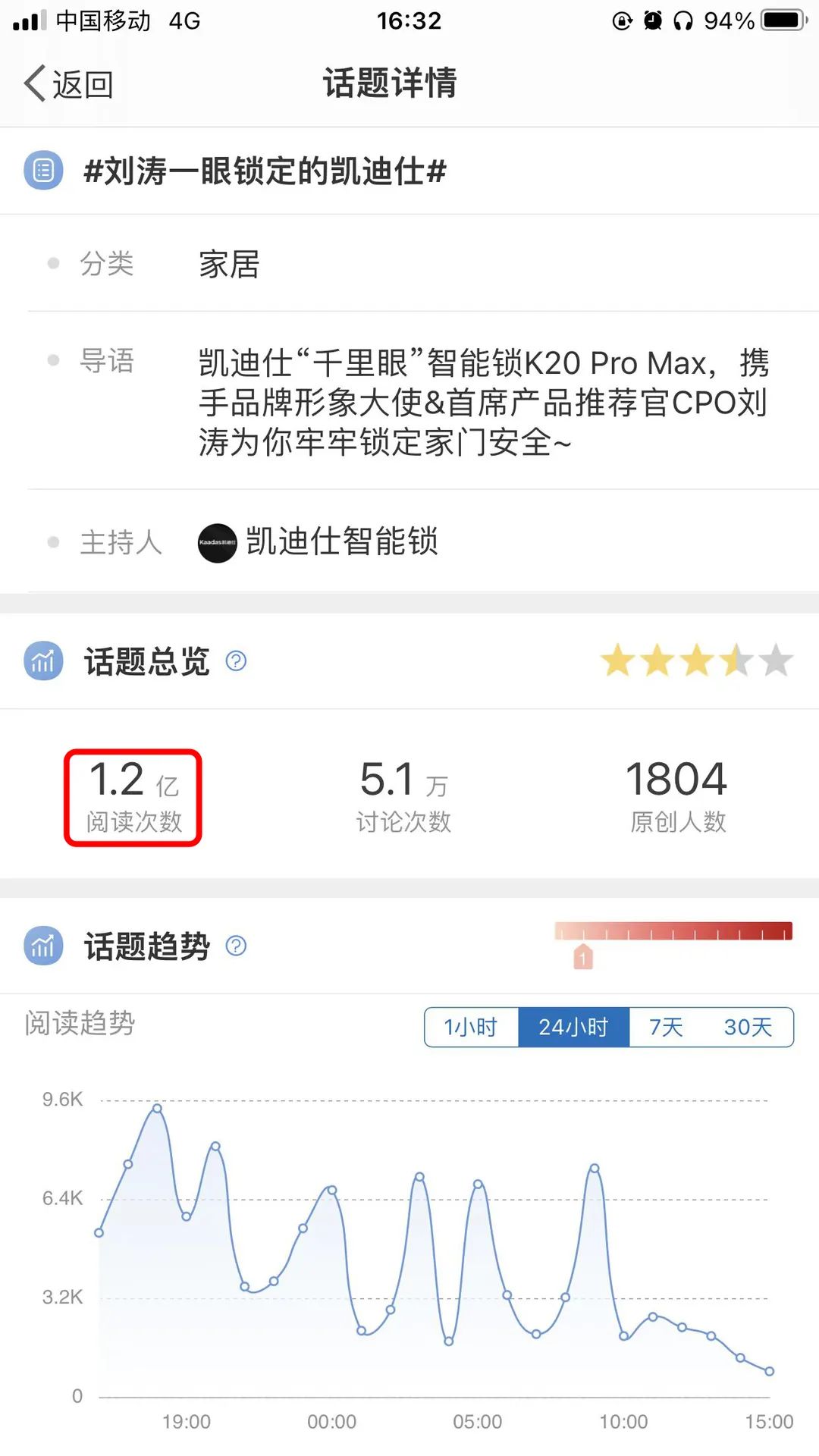 截至目(mu)前(qian),根據巨量雲圖數(shu)據顯示,凱迪仕智能(néng)鎖“千裏眼”K20 Pro Max相關內(nei)容在(zai)抖音平檯(tai)總曝光量達15.5億+;微博平檯(tai)數(shu)據,凱迪仕話(hua)題閱讀量已突破1.2億次,全網曝光量達16.7億+。