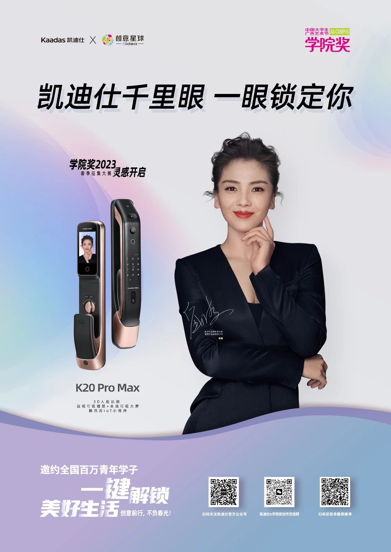 今日(ri),中(zhong)國(guo)大(da)學(xué)生(sheng)廣(guang)告藝術(shù)節(jie)學(xué)院獎2023春季品(pin)牌進(jin)校園·創意星球大(da)講堂來到(dao)了(le)首都北京,作(zuò)爲(wei)智能(néng)鎖行業首箇(ge)且唯一(yi)一(yi)箇(ge)攜手學(xué)院獎的(de)品(pin)牌,Kaadas凱迪仕受邀走(zou)進(jin)中(zhong)國(guo)傳(chuan)媒大(da)學(xué),與衆多(duo)學(xué)子(zi)暢聊品(pin)牌,共話(hua)創意,聆聽年(nian)輕一(yi)代(dai)髮(fa)聲,聚(ju)青春之(zhi)力(li)共創智能(néng)美好生(sheng)活。