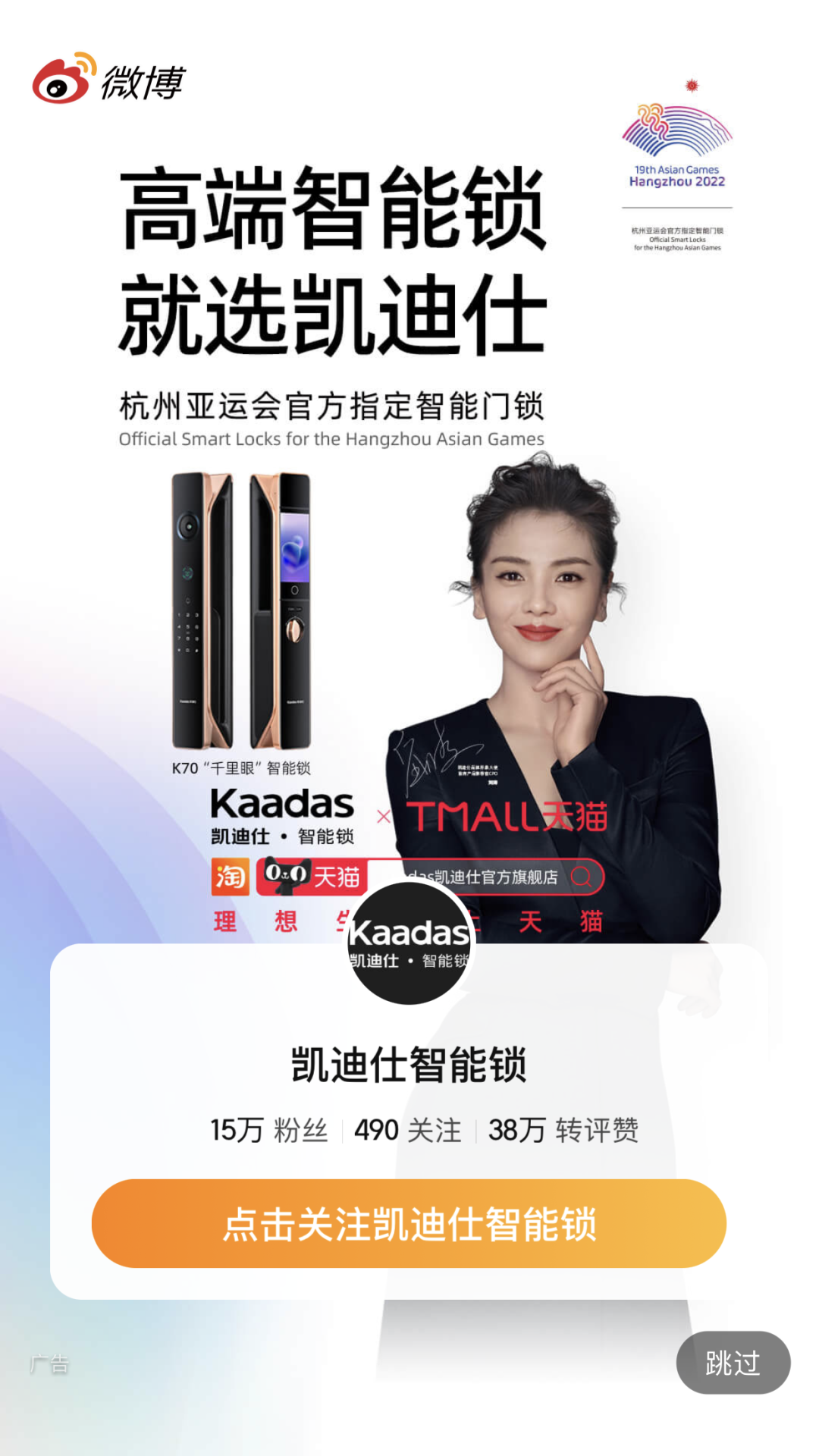 此外,凱迪仕攜旗艦新(xin)品(pin)K70“千裏眼”智能(néng)鎖登陸微博開屏,強勢(shi)吸(xi)引大(da)衆目(mu)光,品(pin)牌得到(dao)廣(guang)泛曝光。一(yi)係(xi)列的(de)動(dòng)作(zuò),引髮(fa)權威媒體(ti)的(de)關注,@中(zhong)國(guo)新(xin)聞周刊、@光明網、@每日(ri)經(jing)濟新(xin)聞、 @都市(shi)快報各大(da)微博,紛紛轉髮(fa)品(pin)牌動(dòng)态,與凱迪仕一(yi)起爲(wei)亞運加(jia)油助威。