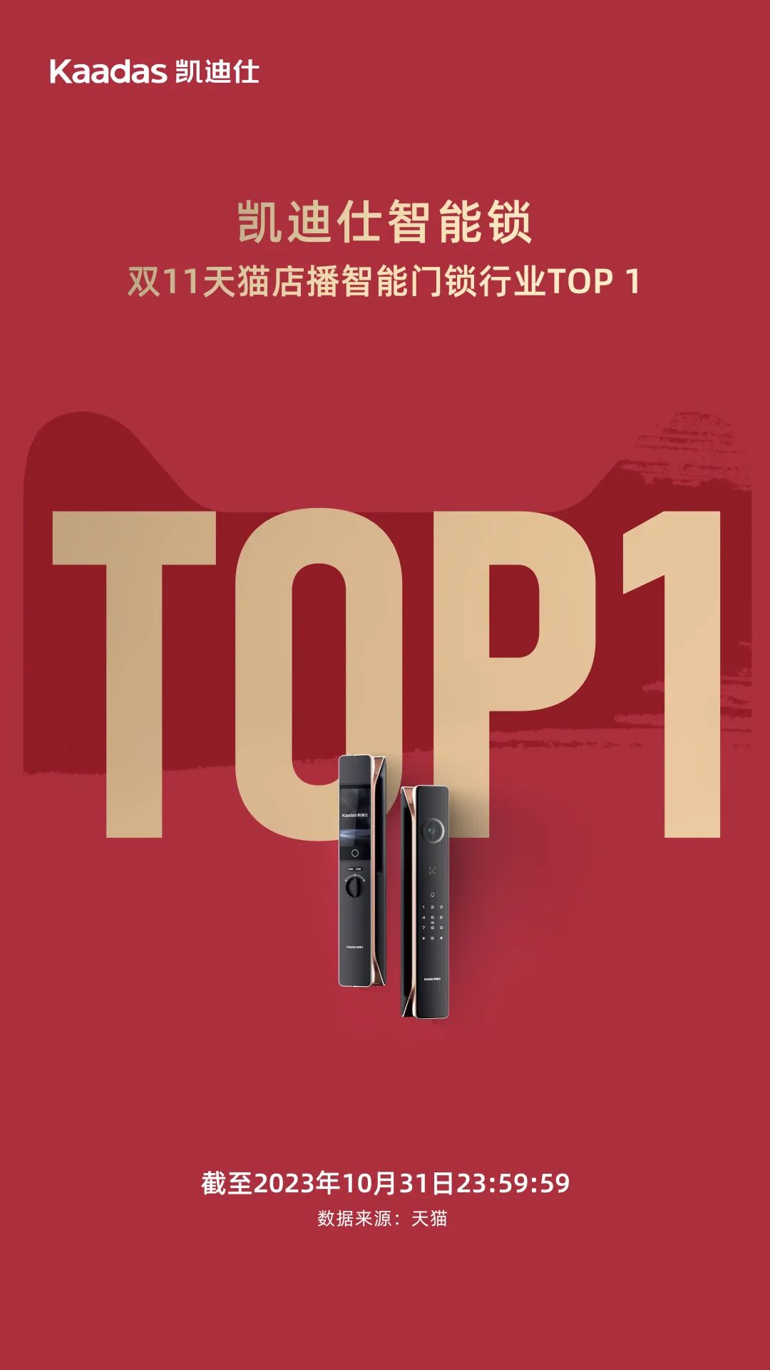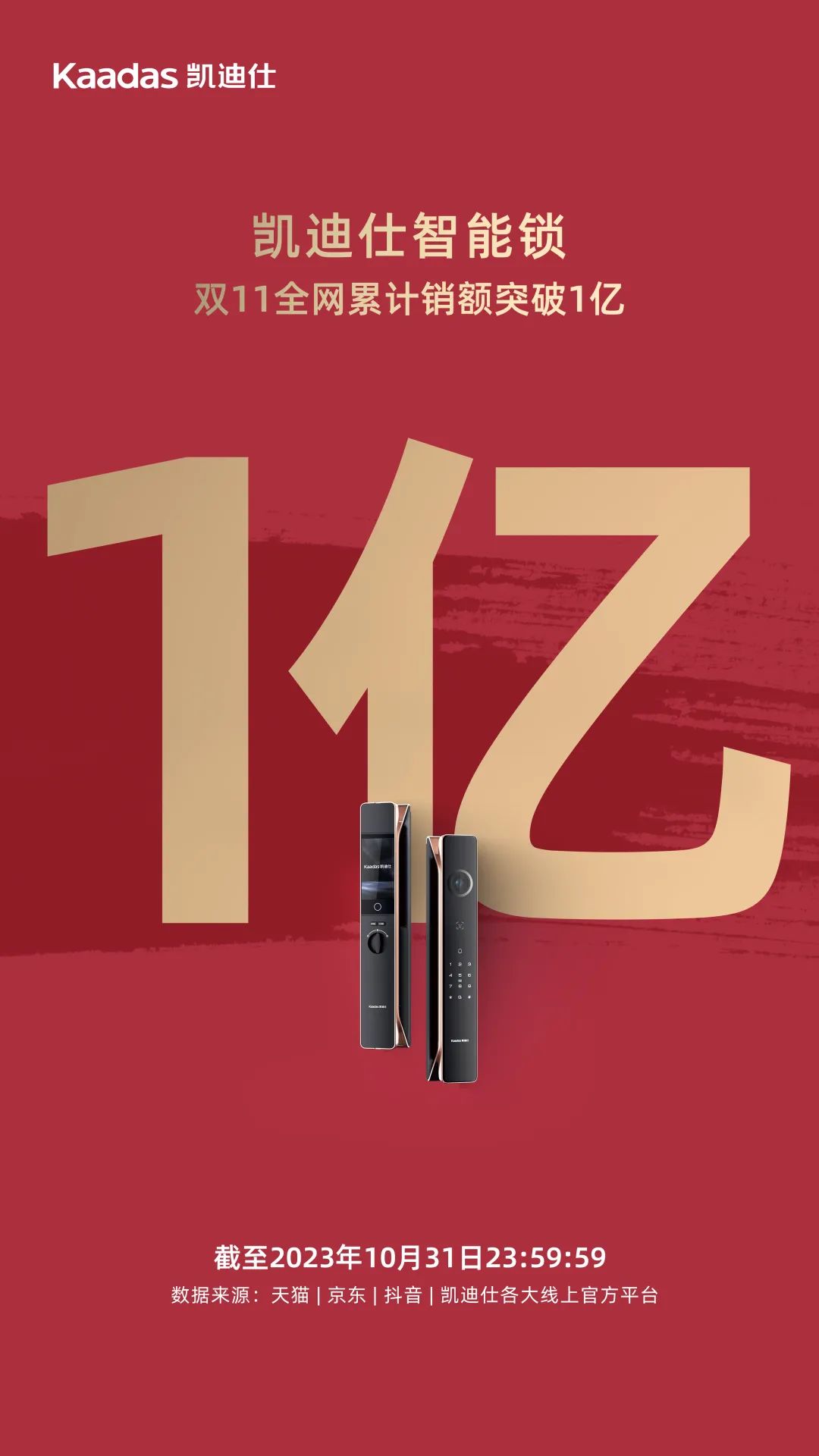 雙11開們(men)紅(hong)首戰告捷!截至10月31日(ri)23:59:59,Kaadas凱迪仕智能(néng)鎖雙11全網累計(ji)銷額突破1億,各大(da)線(xiàn)上官方(fang)平檯(tai)熱賣,以(yi)優(you)質(zhi)産(chan)品(pin)咊(he)高(gao)曝光度持續引爆市(shi)場(chang),再現(xian)行業頭部(bu)品(pin)牌風采。