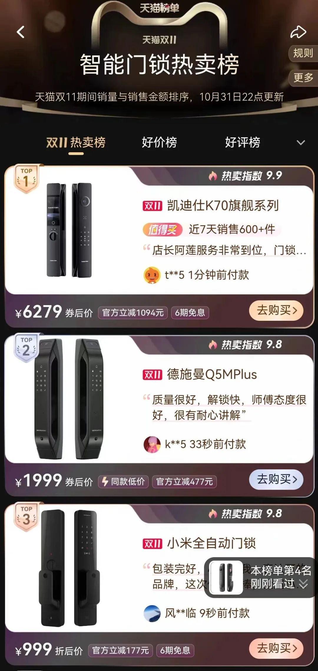 凱迪仕旗艦新(xin)品(pin)K70“千裏眼”智能(néng)鎖,憑借高(gao)顔值咊(he)高(gao)品(pin)質(zhi),熱度居高(gao)不下,斬獲天貓雙11智能(néng)們(men)鎖熱賣榜 TOP1。