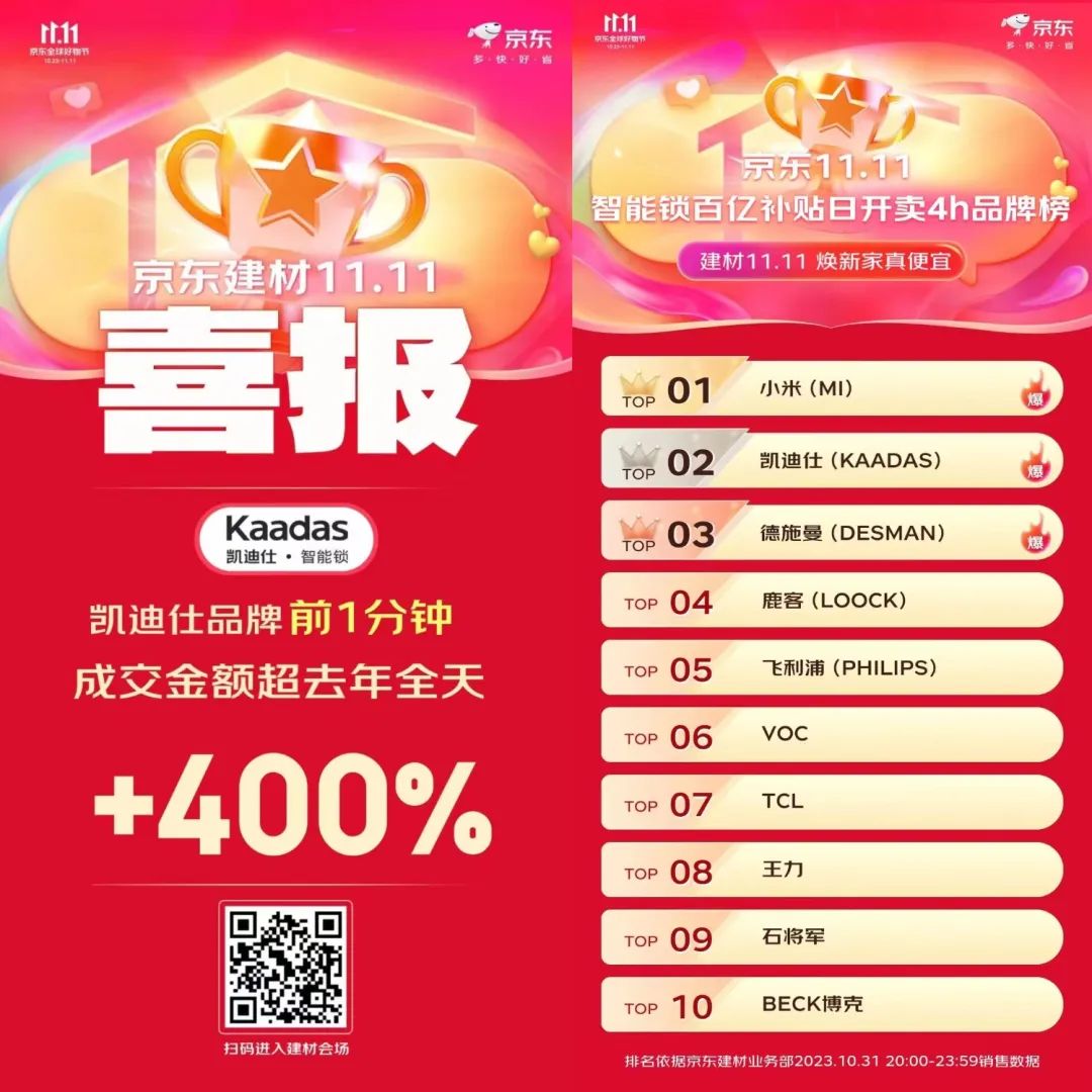 京東平檯(tai)表現(xian)同樣亮眼,凱迪仕品(pin)牌前(qian)1分(fēn)鍾成(cheng)交金額超去年(nian)全天,同比增長(zhang)400%,還獲得京東11.11智能(néng)鎖百(bai)億補貼日(ri)開賣4h品(pin)牌榜TOP2。