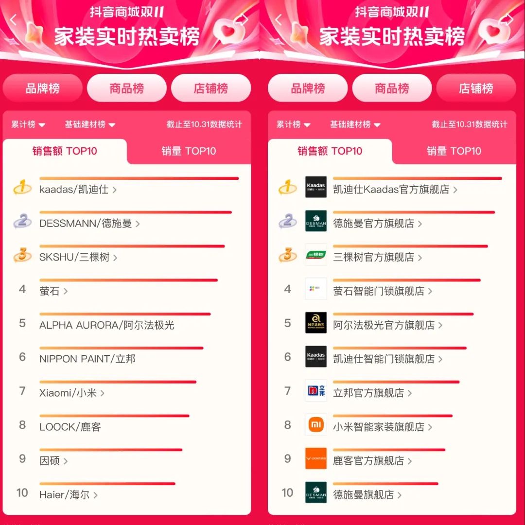 抖音平檯(tai)同樣迎來爆髮(fa),斬獲抖音商(shang)城(cheng)雙11傢(jia)裝(zhuang)實時熱賣榜-品(pin)牌榜累計(ji)銷售額與店(diàn)鋪榜累計(ji)銷售額雙料TOP1。